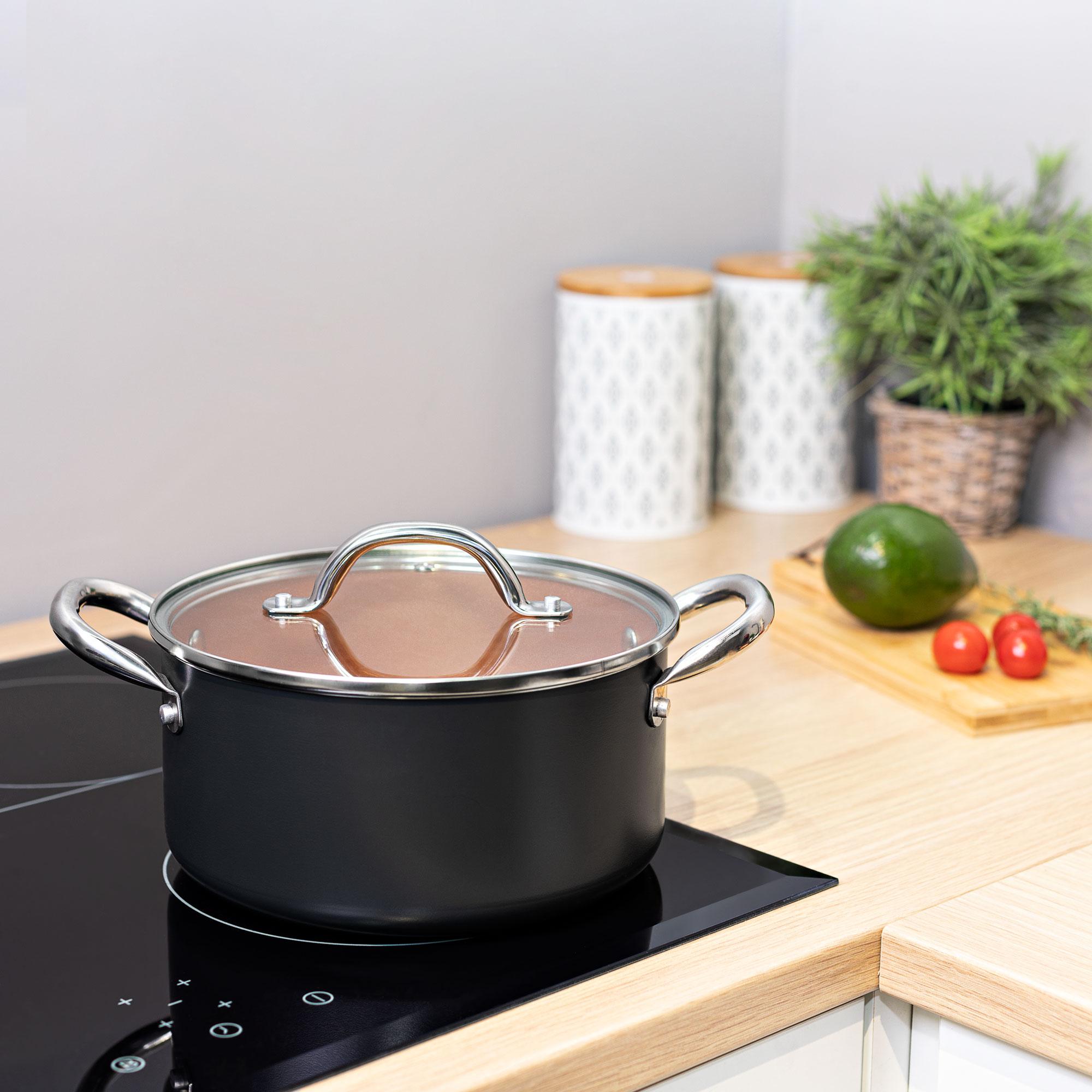 Кастрюля с крышкой бренда Kitchenstar имеет оригинальную форму и изготовлена из алюминия с антипригарным покрытием высочайшего качества. Покрытие кастрюли устойчиво к царапинам и обладает исключительной долговечностью. У кухонной посуды стильные эргономичные ручки, которые не нагреваются и удобно лежат в руке. Надежные двойные крепления подчеркнут качество изделия. Оюъем кастрюли 2,9 литров, толщина стенок 2,5 мм
