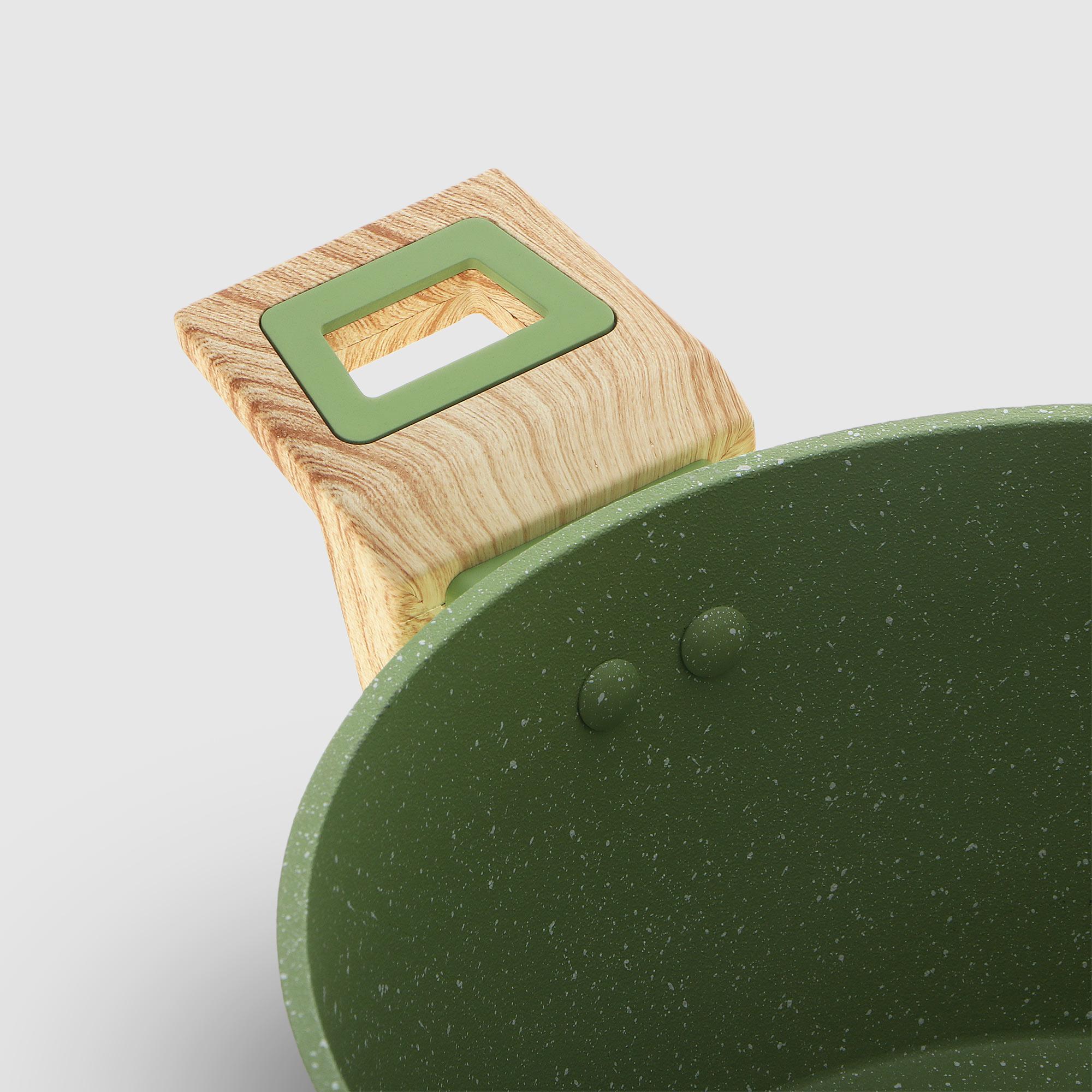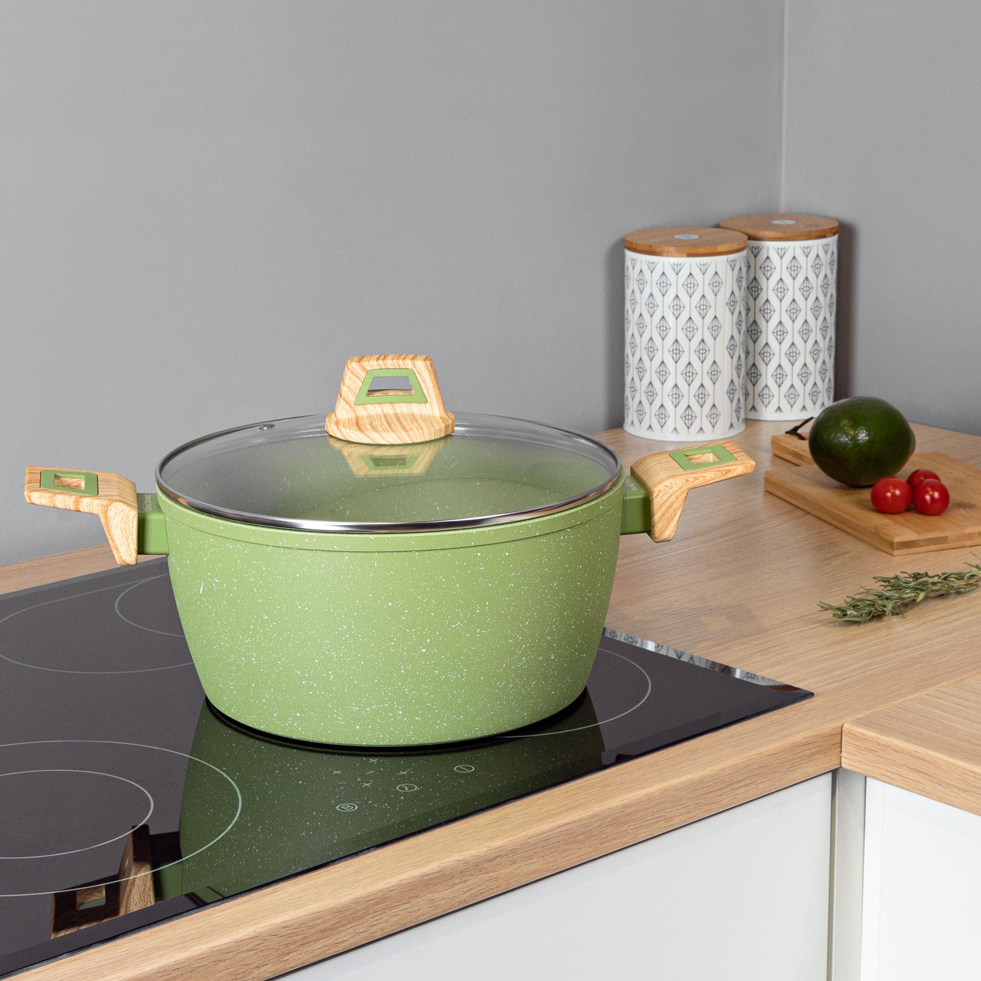 Кастрюля с крышкой Kitchenstar из коллекции Olive Stone имеет освежающий зеленый цвет и изготовлена из прессованного алюминия с антипригарным мраморным покрытием высочайшего качества. Все материалы экологичны и не содержат ПФОК (PFOA) и других вредных веществ. Покрытие, с грубым матовым эффектом внутри и снаружи, устойчиво к царапинам и обладает исключительной долговечностью. Обладает антипригарными свойствами и легко чистится.Стильные эргономичные бакелитовые ручки с дизайном «под дерево» не нагреваются и удобно лежат в руке. Надежные двойные крепления подчеркнут качество изделия.