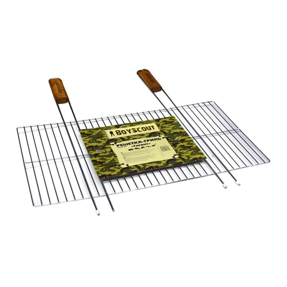 Решетка-гриль предназначена для приготовления пищи на углях. Изготовлена решетка из высококачественной стали с антипригарным покрытием, ручка имеет деревянную вставку, предохраняющую руки от ожогов и позволяющую без труда перевернуть решетку. Большая рабочая поверхность позволяет приготовить большую порцию еды за один поход. Комплектуется картонным веером для раздувания углей. Размер: 55 (+5) х 57 х 30 см. Температурные ограничения отсутствуют.