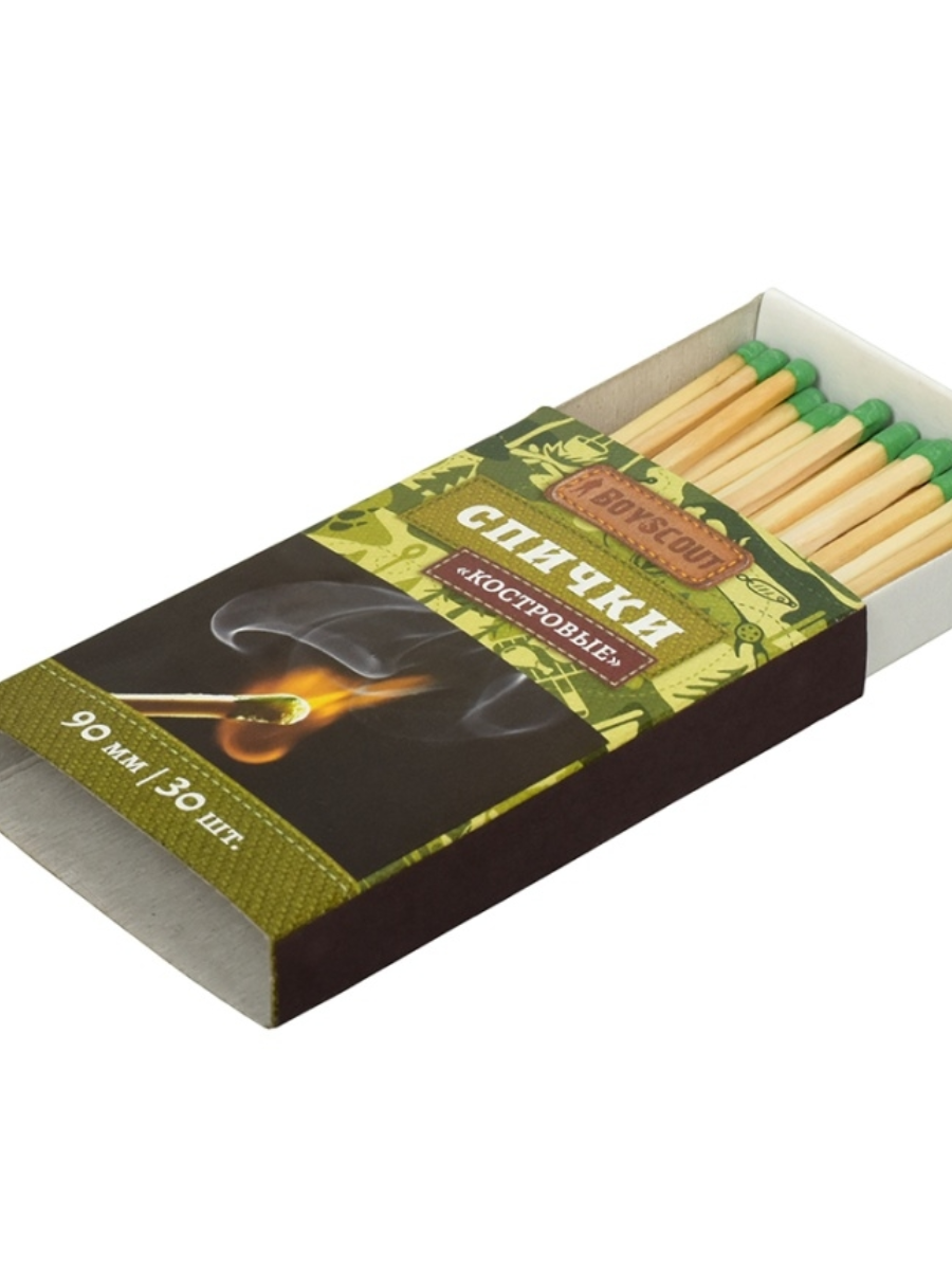 Огонь в походе, на рыбалке, охоте или пикнике является одной из важных составляющих, позволяющих обеспечить тепло и защиту. Поэтому спички и зажигалки должны быть в каждом рюкзаке, даже если вы не планируете ночевку в лесу. Специально для любителей активного образа жизни выпускаются спички «Вулкан» и «Колумб». При разработке этих изделий мы учли все условия походной жизни. Спички «Колумб» горят даже после погружения в воду, а также гарантируют получение пламени при сильном ветре и дожде. В каталоге также представлены оригинальные зажигалки, которыми удобно разжигать угли.