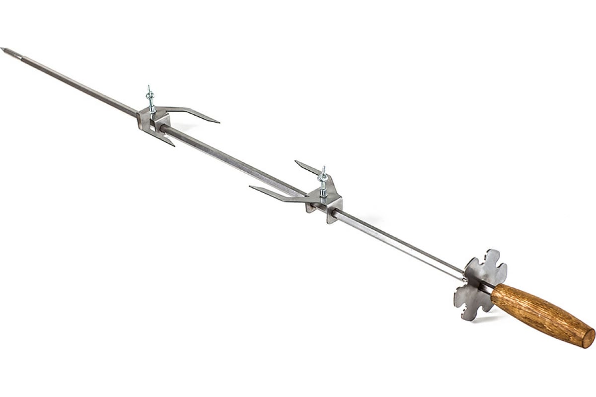 Вертел для мяса и птицы от компании Gratar позволит приготовить птицу или другое блюдо из тушки животного на углях. Также на вертеле можно разместить большие куски мяса. Данный вертел имеет очень надежную конструкцию, состоящую из двух притяжных вилок, которые закрепляются специальными фиксаторами и шайбами. Также около ручки сделаны прорези, позволяющие менять угол фиксации вертела. Ручка же вертела, в свою очередь, изготовлена из твердых пород древесины и не нагревается и защищает руки от ожога. Основная часть вертела изготовлена из качественной нержавеющей стали. Вертел лучше всего подходит для мангалов Gratar Family, которые имеют крышку или ветрозащиту.