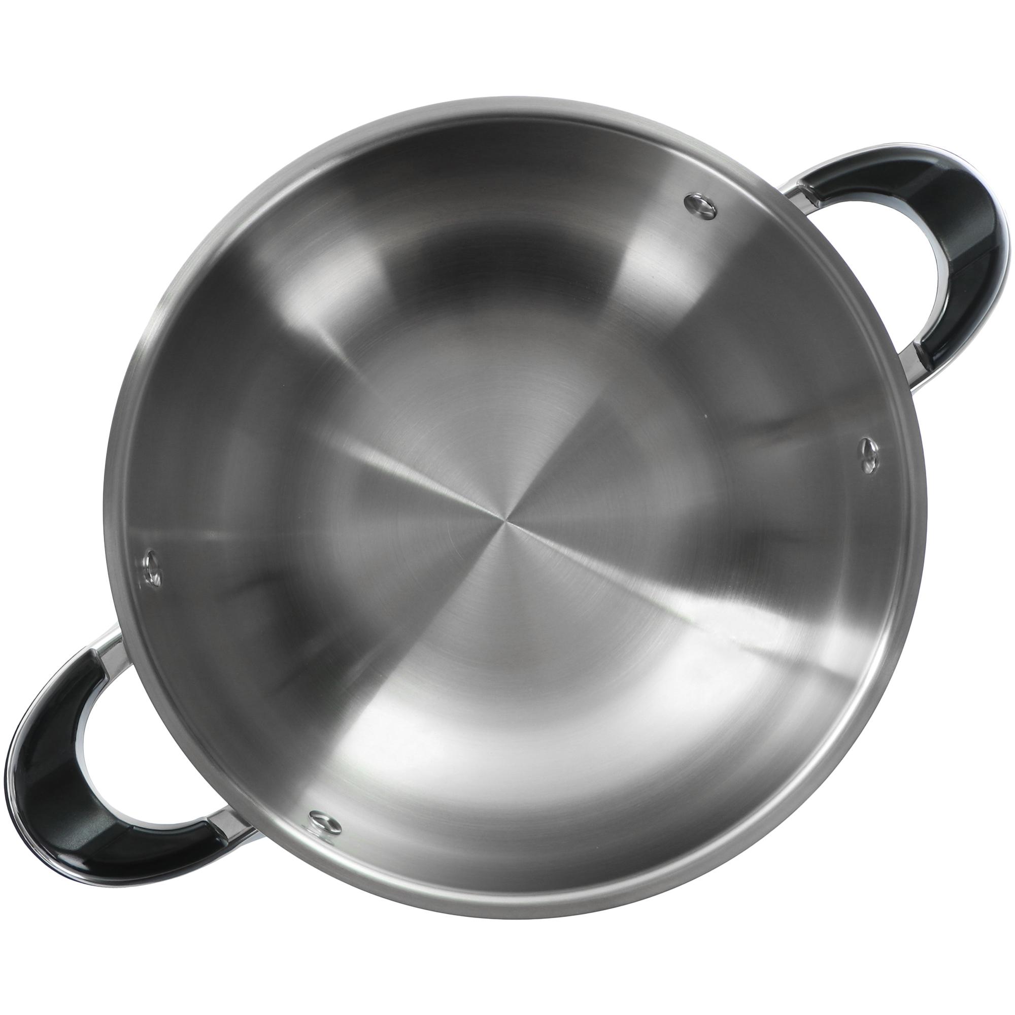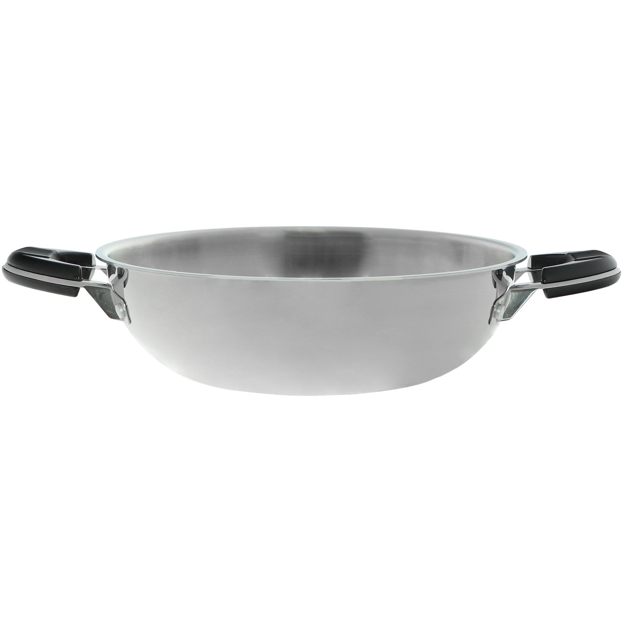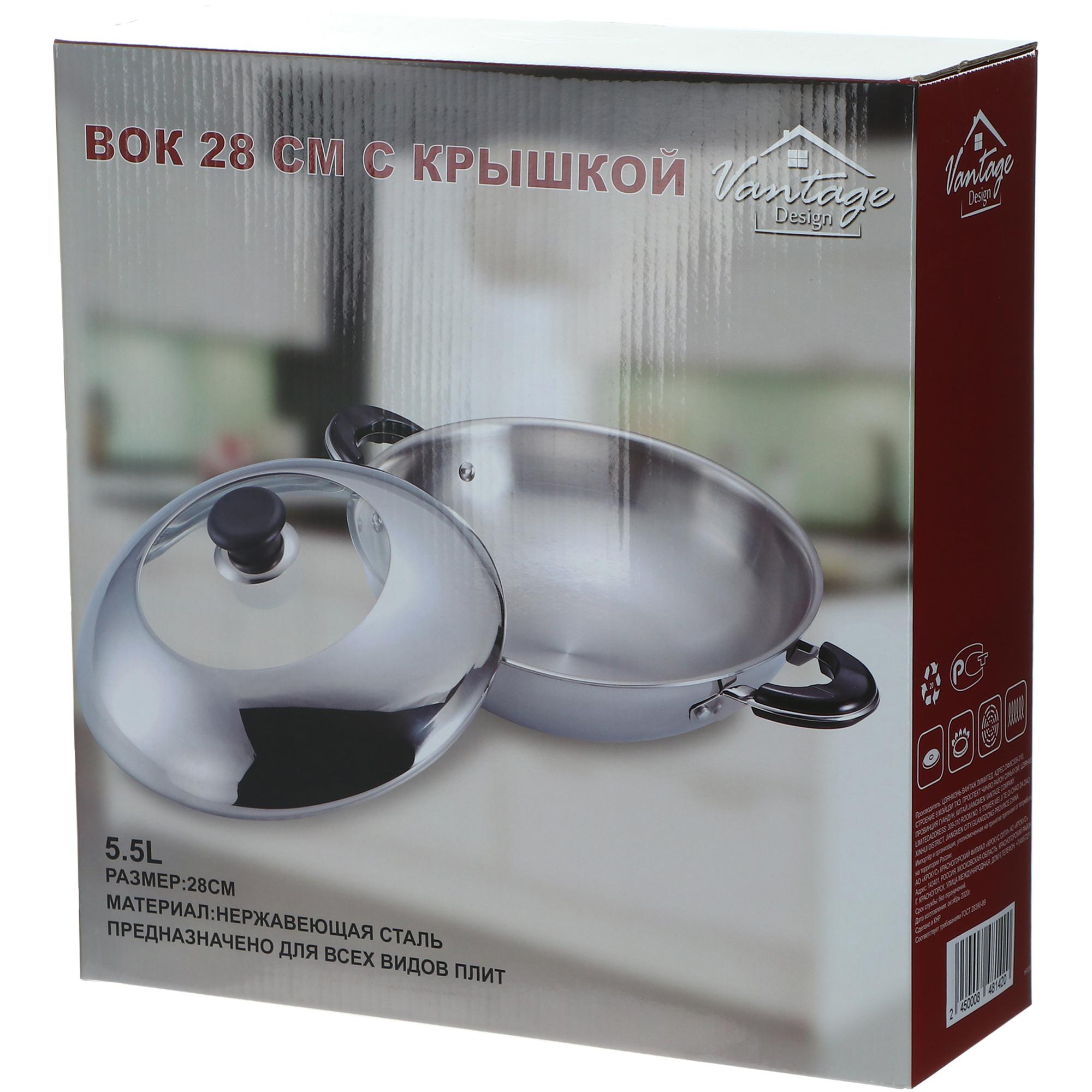 Вок бренда Vantage изготовлен из нержавеющей стали, благодаря чему, несмотря на высокий уровень прочности и долговечности, он легок и не требует особого ухода. Трехслойные толстые стенки и дно с внутренней прослойкой из алюминия гарантируют отсутствие деформации и сильного перегрева. Стальная крышка со стеклянной вставкой и пластиковые держатели в ручках добавляют эргономичности и удобства во время готовки.