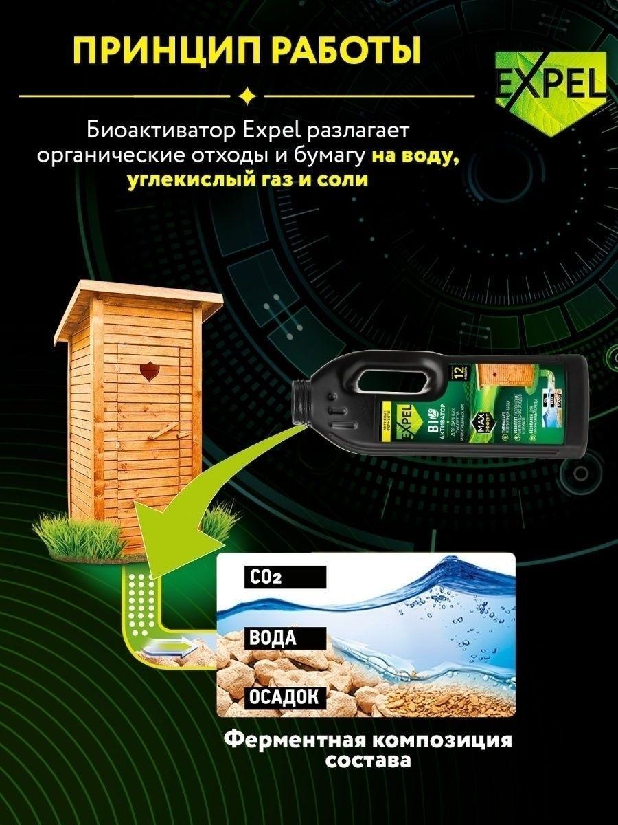 Придерживаетесь принципа - доверяй, но проверяй? Мы уважаем вашу позицию. Проверьте качество EXPEL, доверив ему заботу о вашем комфорте на даче и в загородном доме. Жидкий биоактиватор EXPEL предназначен для улучшения функционирования дачных туалетов и выгребных ям. Биоактивные ферменты, входящие в его состав, ускоряют разложение фекальных масс и бумаги, уменьшают неприятный запах, не нанося при этом вред окружающей среде. EXPEL гарантирует 3 месяца активной бесперебойной работы ваших отходоперерабатывающих систем! Важно заметить - в отличие от жидких биоактиваторов на основе бактерий, формула Expel позволяет с удовольствием использовать продукт, который будет эффективен на протяжении всего срока годности!Превосходный результат без лишних хлопот и агрессивной химии! Уменьшает неприятный запах. Активирует разложение органики и бумаги. Подходит для применения в выгребных ямах. Скоро лето! Чтобы отдых на даче запомнился только приятными моментами, стоит заранее позаботиться о покупке качественных эффективных сре