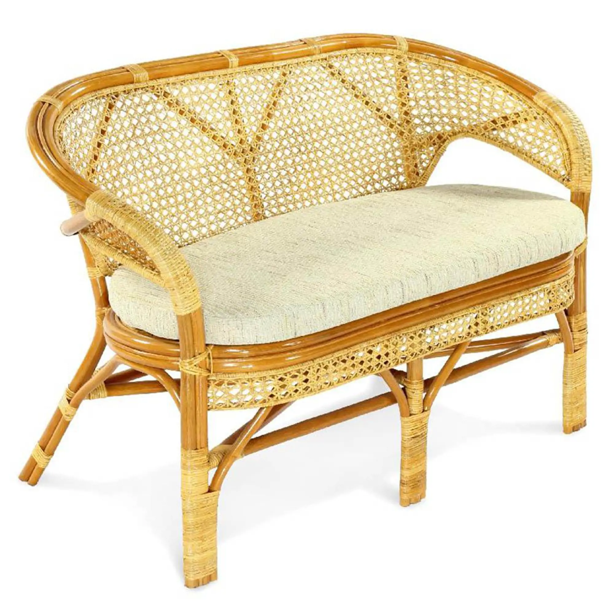 Двухместный диван из ротанга с ажурным плетением из комплекта 02/15. В комплект входит мягкая подушка на сиденье, ткань рогожка. Сиденье дивана выполнено сплошным плетением ротанговой коры, что позволяет эксплуатировать его без подушки. Плетеная мебель — изысканное дополнение интерьера в частном доме, городской квартире, ресторане или отеле. Она комфортна, стильно выглядит, подходит для дома и улицы и служит не менее двух десятилетий.