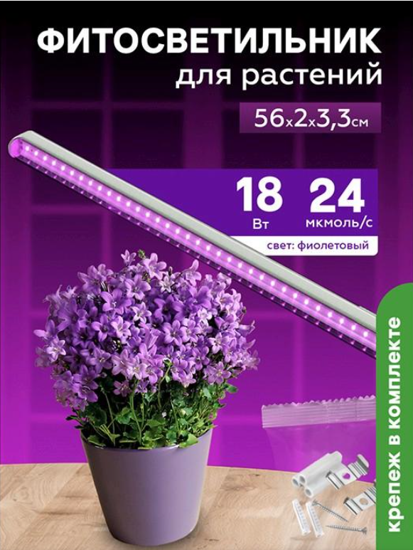 Фиолетовое свечение предназначено для досветки с целью ускорения роста рассады и стимулирования цветения. Мощность светильника составляет 18 Вт, площадь освещения 0,8-1,5 м2. Корпус светильника изготовлен из белого пластика. Рассеиватель из прозрачного полимерного материала. Выключатель расположен на корпусе. Степень пылевлагозащиты светильника IP40. Длина кабеля питания - 1,2 метра. Класс энергопотребления А+. Простой накладной монтаж.