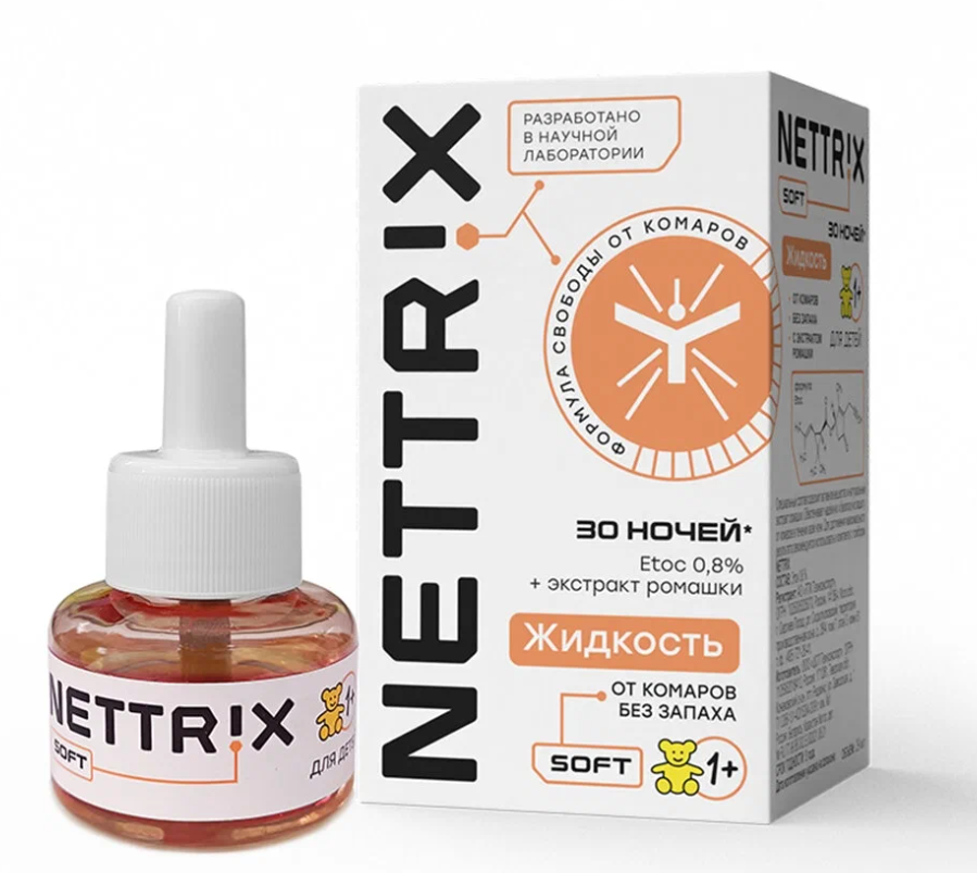 NETTRIX Soft жидкость от комаров содержит активное вещество и натуральный экстракт ромашки. Обеспечивает надёжную и безопасную защиту от комаров в течении всей ночи. Для достижения максимального результата рекомендуется использовать в комплекте с прибором NETTRIX.