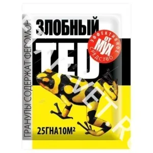 Средство от мух ЗЛОБНЫЙ TED 25 г 73085 – высокоэффективное средство для уничтожения мух и ос в производственных и жилых помещениях, гостиницах, общежитиях, предприятиях общественного питания, магазинах, складах, животноводческих комплексах и так далее. Препарат содержит особые пищевые аттрактанты, а так же половой феромон (химический аттрактант), привлекающий мух на расстоянии – что усиливает привлекательность приманки для насекомых и значительно повышает эффективность. Активное вещество – мощный инсектицид, обладающий почти мгновенным эффектом. Благодаря стабильности действующего вещества, средство отличается выраженным пролонгированным действием. С целью повышения эффективности препарата и значительного улучшения экономии расходов разработана новая инновационная схема обработки помещений. Метод основывается на применении подложек - метод нанесения мазками. Подложки развешиваются после полного высыхания препарата. Продолжительность остаточного действия средства при данном способе обработки составляет 6-8 нед