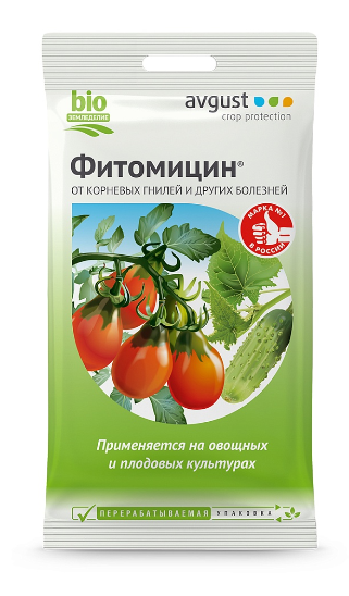 Фитомицин - биологический препарат для борьбы с болезнями овощных и плодовых культур. Эффективно борется с корневыми гнилями и прочими инфекциями, вызванными фитопатогенными бактериями и грибами. Является аналогом природного антибиотика, выделенного из почвенных бактерий. Действует через 12 часов после обработки. Собирать и употреблять в пищу урожай можно уже через 2 дня после обработки. Фитомицин входит в специализированную серию "Биоземледелие". Препараты этой категории подходят для экологичного садоводства, безопасны для людей и животных, не оказывают отрицательного воздействия на полезную микрофлору почвы.