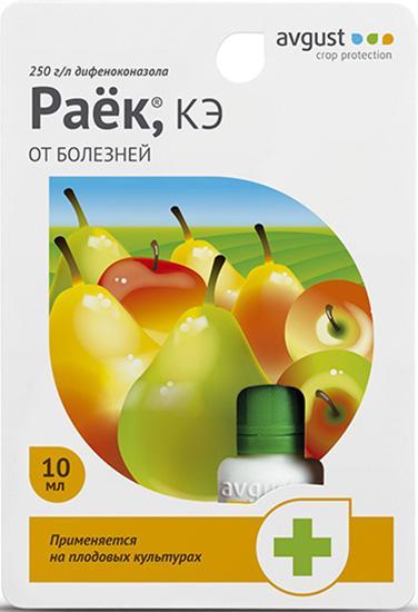 Высокоэффективный препарат для обработки плодовых культур от болезней. Обладает длительным профилактическим и лечащим действием. Быстро проникает в ткани растений и не смывается дождем уже через 2 часа после опрыскивания. Защищает листья и плоды. Не вызывает образования «сетки» на плодах, обеспечивает высокое качество продукции. Сделай из сада маленький рай! Плодовые деревья, произрастающие на дачных участках, часто подвергаются негативному влиянию различных болезней. Особо неприятными являются парша и мучнистая роса. Они не только портят внешний вид плодов, делают их непригодными к хранению, но и значительно ослабляют сами деревья. Первыми признаками болезни являются листья, покрытые черными точками. Современный препарат «Раёк» – надежное средство для борьбы с паршой и мучнистой росой. Механизм действия Благодаря системному действию средство быстро проникает в ткани растений, в которых зимовали возбудители болезней.