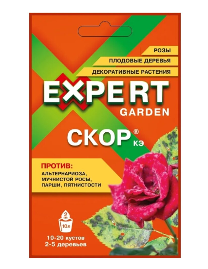 Скор Кэ Expert Garden - системный фунгицид с длительным профилактическим и выраженным лечебным действием предназначен для защиты плодовых культур от болезней, цветочных растений и декоративных кустарников – от мучнистой росы, серой гнили; роз – от чёрной пятнистости.