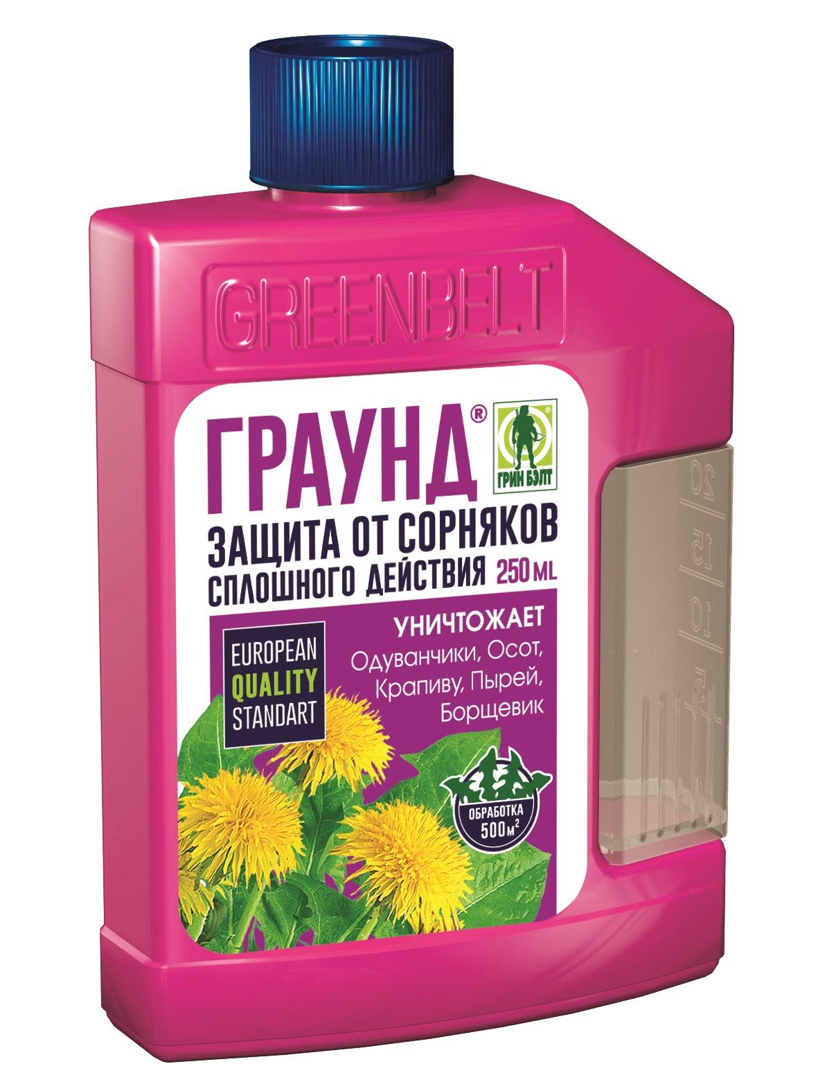 Средство для защиты от сорняков Грин Бэлт Граунд 250 мл 01-235 используется для борьбы с одуванчиком, борщевиком и другими сорняками. Уничтожает растение целиком, вместе с наземными и подземными побегами. Сорняк отмирает через 15-25 дней после обработки.