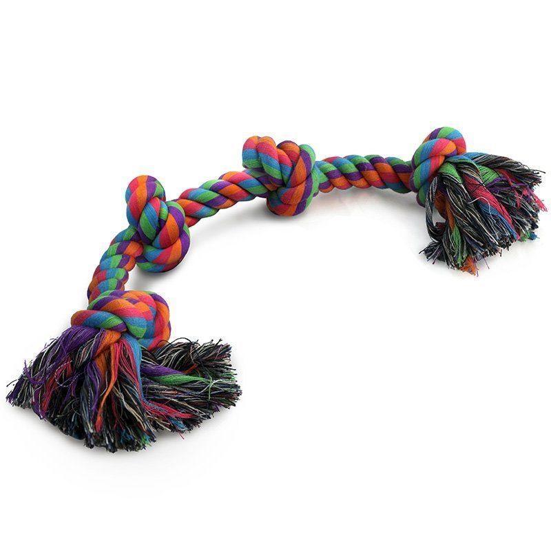 Собаки обожают играть с веревочными игрушками, так как их можно грызть, трепать и носить в зубах. Такие игрушки отлично массируют десны и очищают зубной налет во время игры. Веревки сплетены из нитей натурального хлопка, поэтому безопасны для здоровья Вашего питомца. Цвет: разноцветный. Вес: 330-340 г. Длина: 540 мм. Материал: хлопок. Изображение товара может не соответствовать внешнему виду.