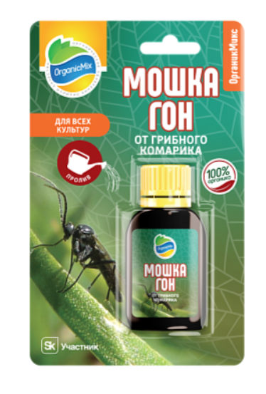 Мошкагон - это органическое средство защиты растений для борьбы со сциаридами (грибными комариками). - Действует на регуляторы роста личинок грибных комариков и предотвращает их развитие во взрослых насекомых - Уменьшает появление новых взрослых особей грибных комариков - Удобное применение - полив - Не вызывает привыкания у насекомых - Действующие вещества полностью биоразлагаемы и не причиняют ущерб человеку и окружающей среде Огромное количество вредителей имеют почвенные стадии развития, которые являются недосягаемыми при применении средств защиты методом опрыскивания, в том числе личинки грибного комарика (сциариды). Препарат предусмотрен для полива почвы и борьбы с личинками грибного комарика. Действующие вещества, входящие в состав, действуют на эндокринную систему и являются мощными регуляторами роста насекомых-вредителей и средством, которое провоцирует отказ от питания и блокирует способность глотать.