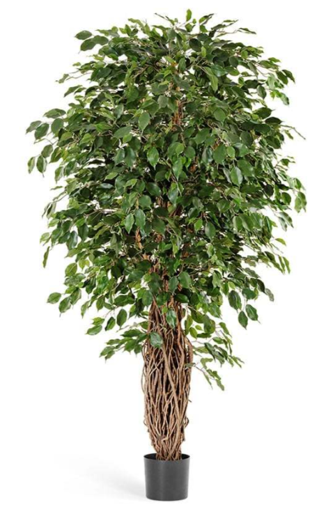 Фикус Бенджамина. Объемная, напоминающее овал, крона с тонким стволом. Цвет - натуральный зеленый. Представляет точную копию живого растения, но не требует особого ухода. Изготовлен в Бельгии. 1705 листов. Перевозится в транспортировочном кашпо указанное на фото.