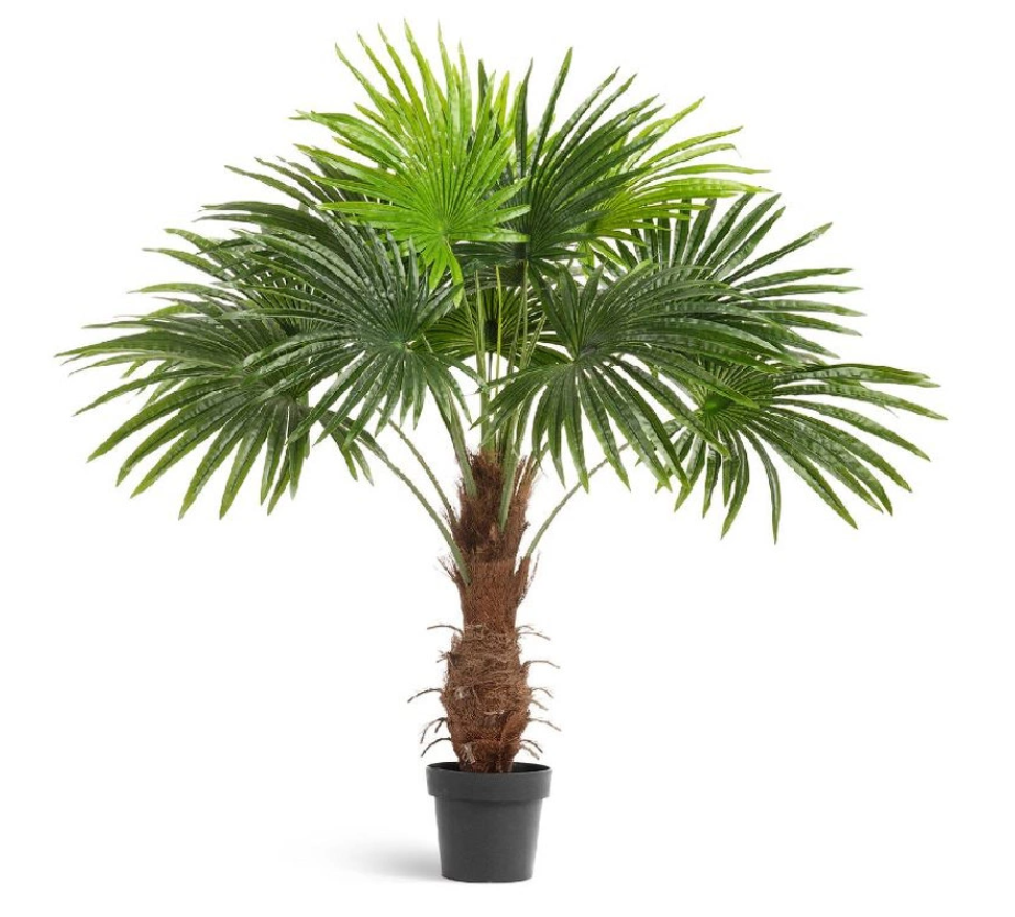 Пальма Вашингтония. Объемная крона, состоящий из множество крупных листьев, и одно толстого стволов. Цвет - натуральный зеленый. Представляет точную копию живого растения, но не требует особого ухода. Изготовлен в Бельгии. Листья - текстиль с пропиткой sensitive botanic. Ствол - полимер с имитацией. 1 ствол, 15 веток с листами, 1 узкий лист в виде стрелки. Перевозится в транспортировочном кашпо указанное на фото.