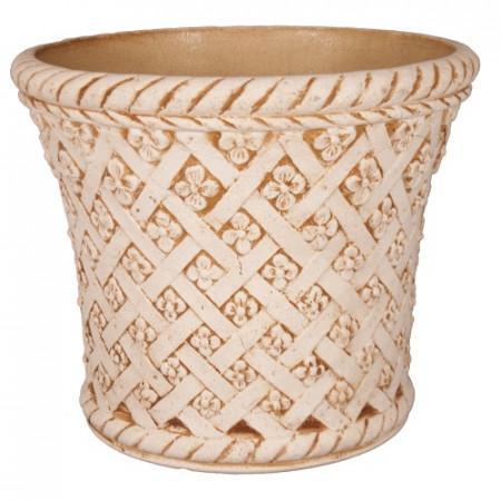 Цветочный горшок изготовлен из шамотной глины высокотемпературного обжига. Изнутри покрыт специальной кварцевой глазурью. Выполнен в бежевом цвете с оттенками коричневого на узорах. Декорирован объёмным ромбовидным плетением с цветами, сверху и снизу горшка в виде ободка расположен объёмный жгут. Горшок по форме напоминает классический горшок чуть расширяющийся в верхней части. Преимущества: Экологически чистый материал, не содержит вредных примесей Горшки обладают высоким сроком службы, более 10 лет Подходит для посадки любых растений Не протекает, не гниет и не болеет грибком Благоприятен для роста и развития растений Подходит для использования в помещениях и на улице Эстетически вписывается в любой интерьер, дополняя растение Описание Горшок керамический Валентин выполнен в виде классического горшка с интересным декором.