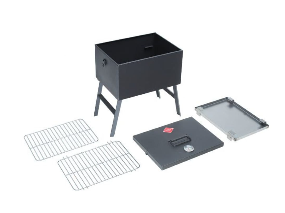 Коптильня со съемными ножками предназначен для копчения продуктов, но также используется для готовки блюд на углях. На крышке расположен термометр для контроля процесса копчения. Изделие имеет жаростойкое покрытие, выдерживающее температуру 700°С. Отличается долгим сроком службы. В комплект входят две решетки и лоток для сбора жира.