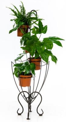 Подставка для цветов выполнена из металла. Предназначена для размещения пяти горшечных растений. Декорирована коваными элементами.