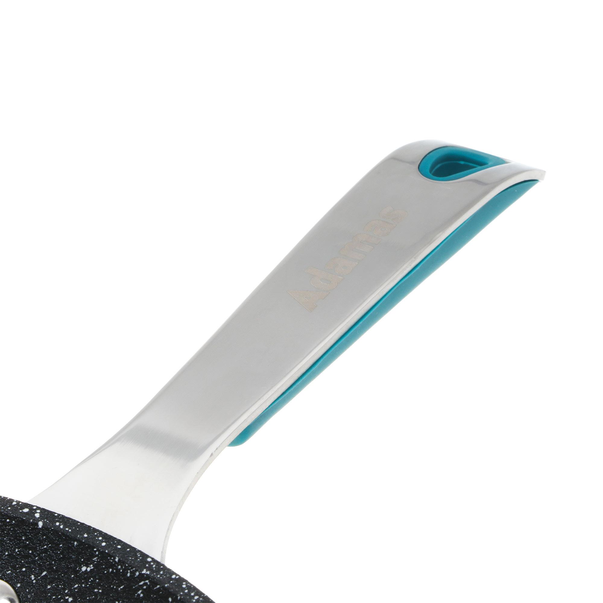 Сковорода выполнены из прочного и легкого алюминия. Ненагревающиеся ручки – из нержавеющей стали с силиконовыми вставками. Мраморное антипригарное покрытие устойчиво к царапинам. Посуда подходит для индукционных плит. Возможно использовать на электрической, газовой, керамической плите.