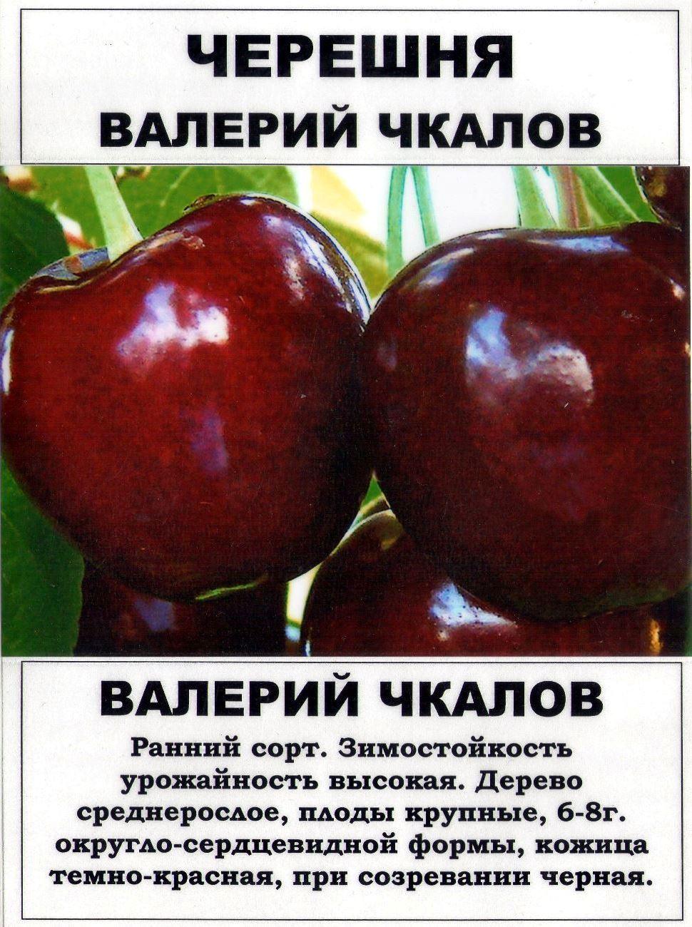 Морозостойкая черешня Валерий Чкалов названа в честь летчика, славится богатыми урожаями вкусных ягод. Разновидность самобесплодная. Цветет сорт в мае, плоды созревают примерно через месяц. Первые урожаи появляются спустя 5-6 лет. Сорт ежегодно плодоносит, по 30-60 кг с взрослого дерева, в зависимости от климатических условий произрастания.