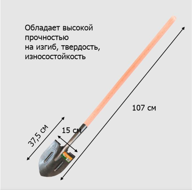 Лопата отличается повышенной твердостью – показатель определения твердости по методу Роквелла – показывает 34-35 HR (для сравнения, твердость качественного сверла по металлу – 60 HR).
