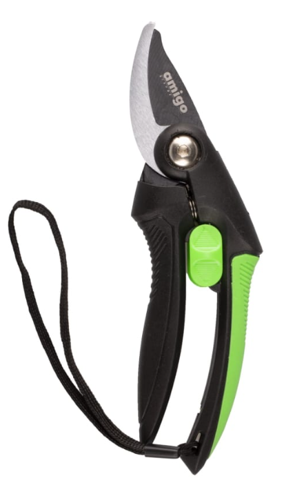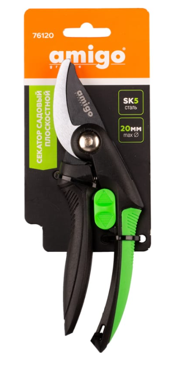 Секатор AMIGO 76120 плоскостного типа подойдет для обрезки нежных живых растений. Он бережно и точно обрежет как тонкие стебли цветов, так и более плотные ветки кустарников диаметром до 20 мм. Сталь лезвий SK-5 долго сохраняет режущие свойства, поэтому секатор будет в строю продолжительное время. Лезвия защищены антикоррозийным покрытием, это сбережет их от сока растений.