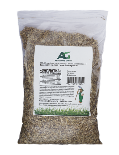 Газонная травосмесь ABSOLUTE GREEN Заплатка 250 г 00000000639 используется для подсева пустующих пространств и проплешин, залысин, при образовании на участках засева газонов озеленительной линейки. Наличие в травосмеси Райграса пастбищного даёт быстрые всходы. Газон прорастает уже на пятый день. Норма высева 4-5 кг на 100 м2.