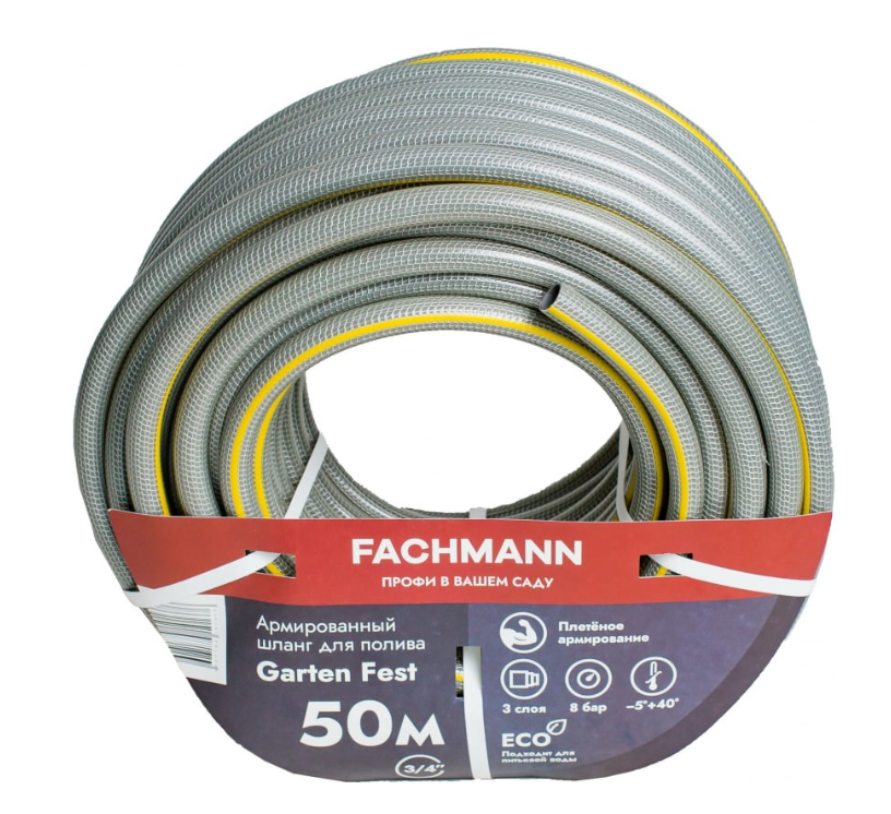 Садовый шланг Fachmann Garten Fest 3/4, 50м 05.021 предназначен для полива, а так же для перекачки и прочих работ с жидкостями, в том числе с пищевыми.