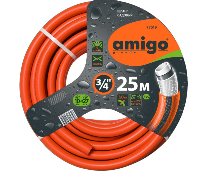 Садовый пятислойный шланг AMIGO 3/4", 25 м 77019 предназначен для полива, а так же для перекачки и прочих работ с жидкостями, в том числе с пищевыми.