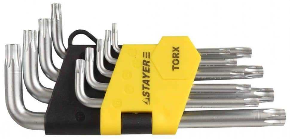 Набор ключей STAYER MASTER имбусовые короткие, Cr-V, сатинированное покрытие, пластик. держатель, T10-T50мм, 9 пред 2743-H9 отлично подходит для закручивания и откручивания крепежа с шлицем TORX. Инструменты сделаны из хромованадиевой стали, стойкой к большим нагрузкам. Благодаря Г-образной форме обеспечен большой крутящий момент.