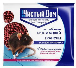 Гранулы от крыс и мышей Чистый дом 50 г 03-047 - удобное средство для полного уничтожения грызунов. Способ применения: Поместить приманку в лотки или на подложки по 10-20 г (1-2 ст. ложки) для мышей, по 30-50 г (3-5 ст. ложек) - для крыс. Размещают ёмкости в предварительно выявленных местах обитания грызунов: поблизости от их нор, на путях перемещения, вдоль стен и перегородок. Расстояние между точками раскладки 2-10 м в зависимости от захламлённости помещения и численности грызунов. Места раскладки осматривают через 1-2 дня, а затем с интервалом в одну неделю, восполняя приманку по мере её поедания.