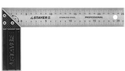 Сверхточный угольник столярный Stayer серии Profi применяется для контроля конструкций и поверхностей на соответствие углу 90 градусов, проведения измерительно-разметочных работ в строительном деле. Гравированная шкала с единицей измерения 1 миллиметр нанесена с двух сторон, а также в верхней и нижней части линейки. Основное измерительное полотно выполнено из прочной инструментальной стали, что позволяет пилить лобзиком или дисковой пилой непосредственно по угольнику, используя его как параллельный упор. Широкая алюминиевая основа удобна в использовании. Инструмент оснащен отверстием для подвешивания. Размер изделия составляет 210x70 мм по внутренним сторонам угольника.