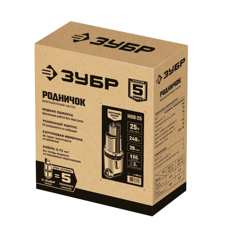 Вибрационный насос с верхним забором воды ЗУБР Родничок-В кабель 25 м НВВ-25 - идеальное устройство для перекачивания жидкостей, благодаря своей производительности, простоте конструкции и неприхотливости в эксплуатации. Может использоваться при осушении емкостей, для забора воды из скважин и колодцев, осушения затопленных мест, откачки воды из подвалов, аэрации и циркуляции воды.