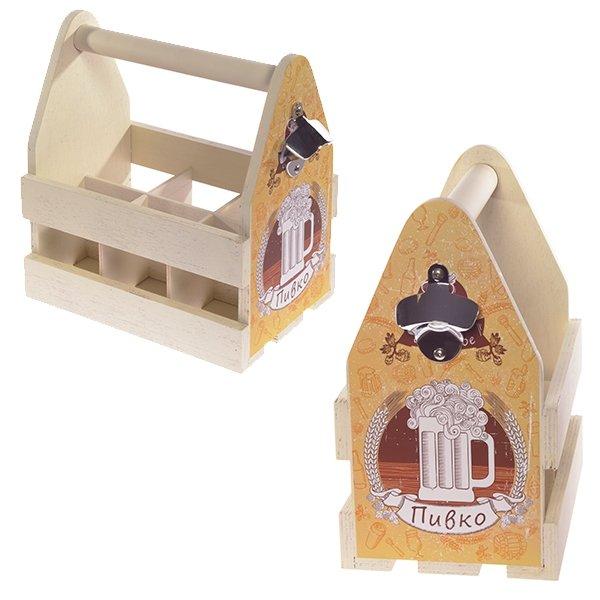 Деревянная переноска для 6-ти бутылок - необычное решение для декора помещения, а также оригинальная упаковка для подарка. Подходит для стандартных пивных бутылок 0,33 л и менее. Также переноска оснащена металлической открывалкой.
