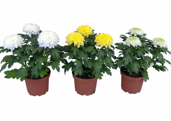 В горшках выращивают крупноцветковые многолетние хризантемы.