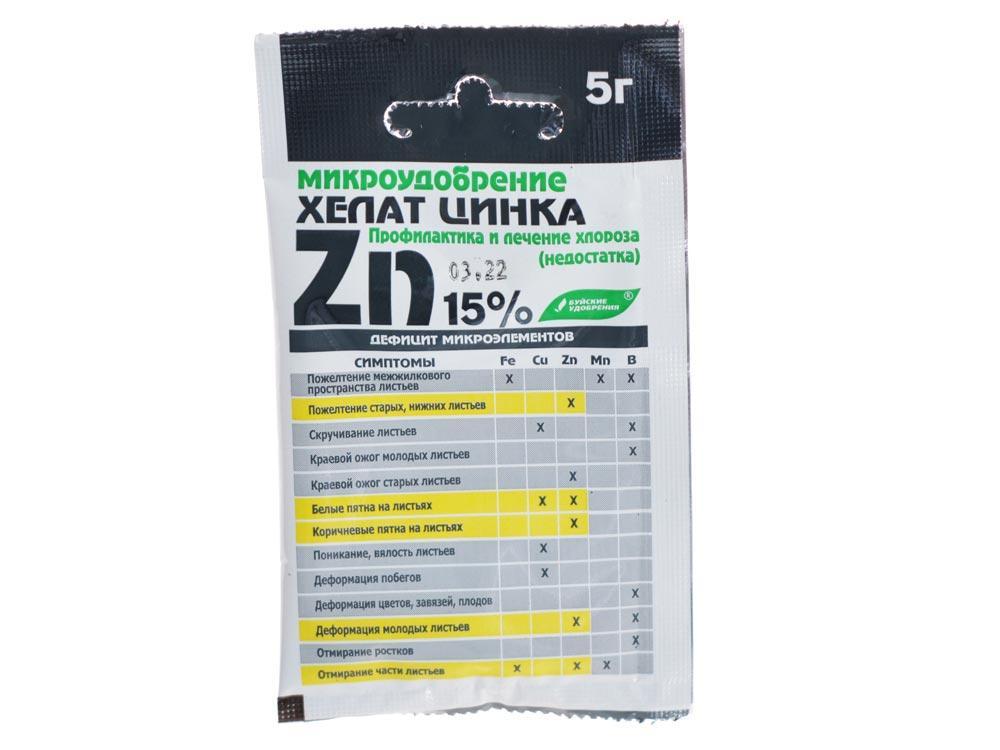 Микроудобрение Буйские удобрения Хелат цинка 5 г 4650100151933 используется для выращивания домашних, садовых культур и рассады. Устраняет дефицит цинка, служит для профилактики и лечения хлороза. Борется с появлением белых и коричневых пятен на листьях, их пожелтением, а также деформацией и отмиранием.