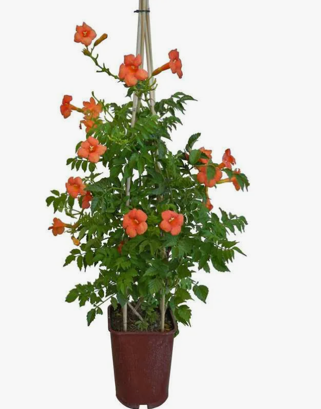 Сильнорослая лиана с декоративными трубчатыми крупными ярко-красными цветкаи в июле - сентябре. Лучше цветёт в тёплых солнечных местах, защищённых. Карабкается при помощи цепляющихся корешков, но в молодости нуждается в подвязывании. Молодые побеги зеленые, после одревеснения светло-коричневые. Начинает вегетацию весной, что позволяет молодым побегам меньше повреждаться заморозками. В конце мая начинается интенсивный рост и до начала июня образуется буйная масса.Подходит для посадки у различных опор, напр. у беседок, пергол.Особенно хорош для покрытия стен и мощных опор. Зимостойкость средняя до-26.Требует укрытия на зиму .